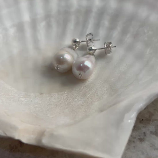 Baroque pearls embody the beauty of imperfection, each one with its own unique shape and iridescent glow. Set against sterling silver with a touch of sparkle, these earrings make a statement while remaining versatile enough for both casual and formal wear.